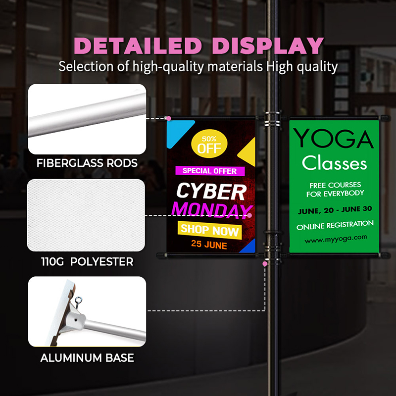 Custom street banners, also called pole banners, light pole banner brackets, or street light banners, would usually be displayed high on building or street pole, which can be seen from a distance, therefore, it would definitely be an ideal way to highlight your marketing. It can be used on streets, in museums and schools, and at sporting events to promote your business. And it is also an easy way to boost the atmosphere of any street. Therefore, it is also a great decoration for any events to celebrate special occasions and holidays.